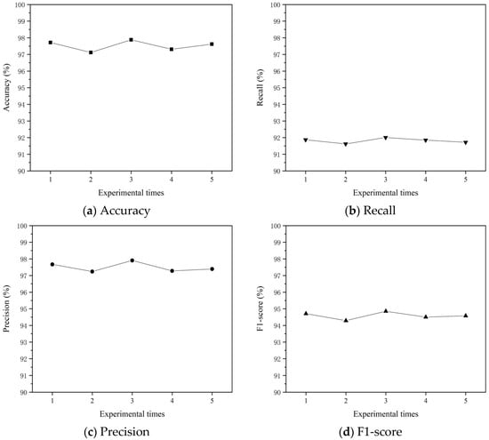 As can be seen in Figure 9, the Accuracy and Precision of the model is around 97% and the Recall is also over 91%, while the F1-score reaches over 94%. The model’s four performance metrics remained stable across all five experiments, indicating its reliability. Table 4 shows the model’s performance on the test data, which was calculated by averaging the results of the five experiments. The results show that Accuracy is 97.53%, Precision is 97.50%, Recall is 91.81% and F1-score is 94.59%.