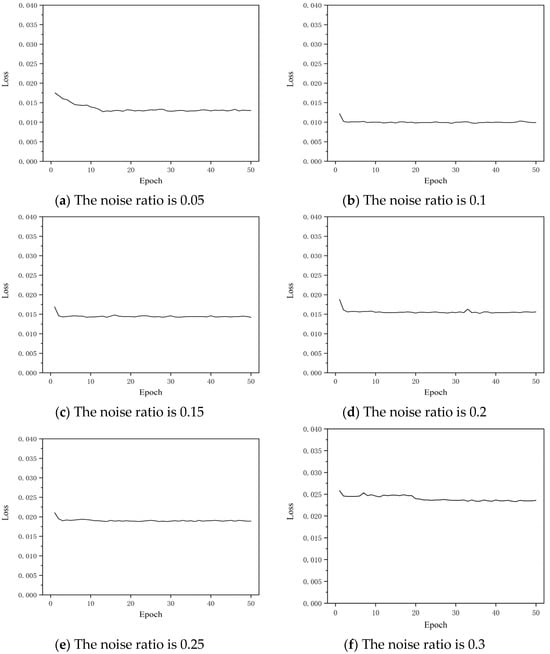 It can be seen from Figure 10 that under the same training round, when the noise ratio is 0.1, the training loss value is the smallest, which indicates that the feature extraction and data reconstruction ability of the model is the best at this time. In addition, Figure 10c–f show that if a larger proportion of Gaussian noise is added, the loss value of the model will increase. Therefore, it is necessary to add an appropriate proportion of noise in combination with the actual situation of the data, which will help the model extract robust data features and better reconstruct the data.
