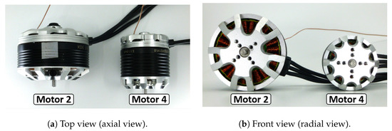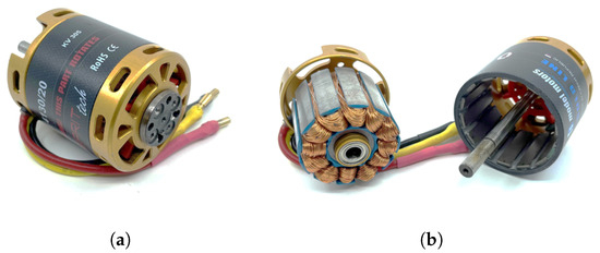 A BLDC motor converts electrical power in its stator to mechanical power out of its rotor via magnetic interactions. Current enters select stator windings and generates a magnetic field around the stator. The rotor’s permanent magnets (Figure 1) seek to align with the stator field, and the resulting magnetic forces apply a net torque on the shaft that spins the rotor. Other motor types, such as induction or axial-flux motors, rely on different approaches to generate the stator–rotor magnetic interactions. References [4,5,6] discuss these differences in more detail.