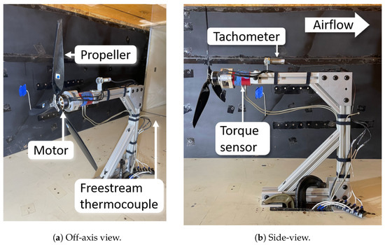 Fixed-pitch propellers applied the necessary load to the test motors. The motor–propeller pairing followed recommendations from the motor manufacturer regarding propeller diameter and the number of blades. The propeller’s applied torque changed as the wind tunnel velocity changed for a constant propeller speed. This load-flow coupling had broader implications on the heat transfer study, which Section 2.6 discusses. The axial flow configuration is typical of the widest variety of electric aircraft, including fixed-wing airplanes and rotorcraft in axial climb.