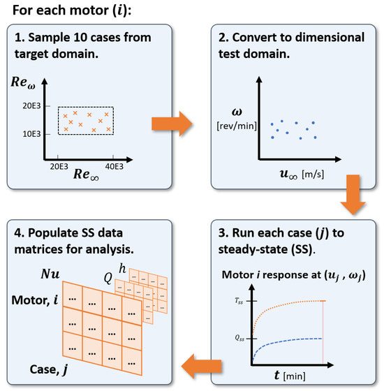 The test stand in Figure 2 generated experimental data per the approach visualized in Figure 3. Section 2.1, Section 2.2 and Section 2.3 discuss the stand, the tested motors, and the stand’s instrumentation, respectively, in more detail. For each test motor (Section 2.2), a Latin hypercube sampler selected 10 points from the 2D Reynolds domain (Section 2.4). The motor operated under load in the wind tunnel at the corresponding freestream velocity and rotational speed until it reached thermal steady-state (Section 2.7), which populated steady-state data for numerical correlation (Section 2.8).
