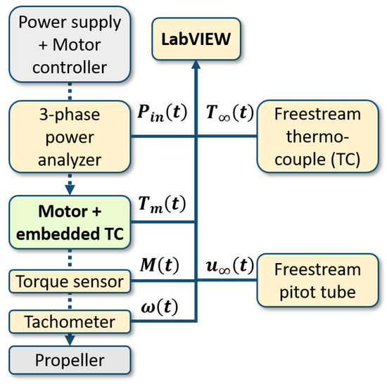 The instrumentation system abstracted in Figure 5 measured salient time-varying electrical, mechanical, and thermal parameters. A National Instruments data-acquisition board (DAQ) and LabVIEW 2019 software (Austin, TX, USA) sampled and recorded the readings at 1 Hz. Tests lasted on the order of minutes, depending on the applied load and freestream velocity. A Figshare repository contains the transient test data (see link in Data availability).