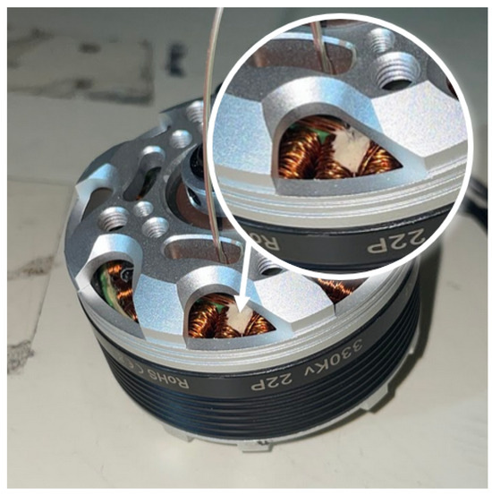 K-type thermocouples measure the motor temperature () and the freestream air temperature (). The thermocouple, which measures motor temperature, is bonded inside the motor with thermal cement, as shown in Figure 6. The difference between these temperature measurements yields the motor’s instantaneous temperature differential with respect to freestream temperature (, Equation (6)).