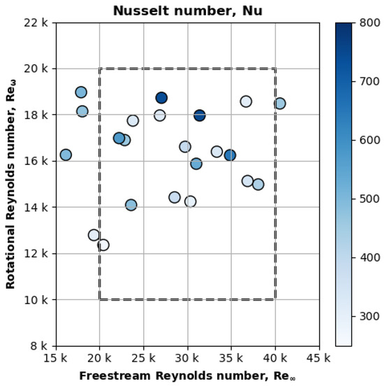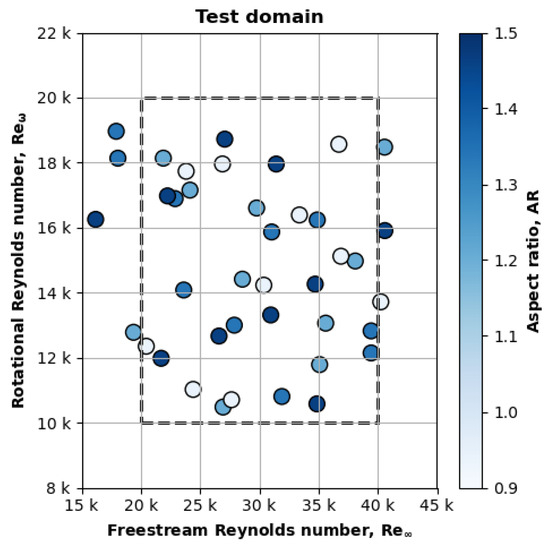 Figure 8 plots all of the experimental test cases as a function of the three control variables: freestream Reynolds number (), rotational Reynolds number (), and the motor’s aspect ratio (). The x-axis is the freestream Reynolds number, the y-axis is the rotational Reynolds number, and the color bar is the aspect ratio. Almost all test cases fell within the target bounds (dashed box) of Figure 8 as desired. The Latin hypercube sampling successfully distributed test points for each aspect ratio motor across the Reynolds domain.