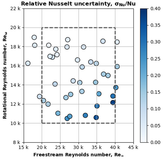 Figure 9 plots the relative uncertainty of the measured Nusselt number for all the cases. The x-axis is , and the y-axis is . The color bar is the relative uncertainty of the measured Nusselt number (). A darker data point indicates larger uncertainty for the measured Nusselt number.