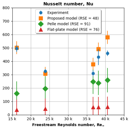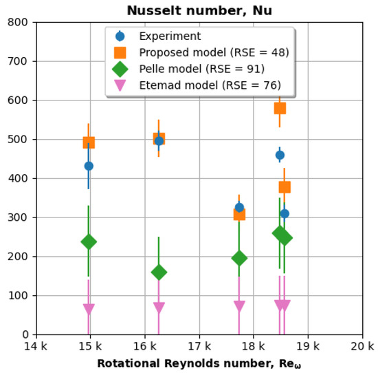 Equation (11) is the model Pelle developed for axial flow impinging on a rotating disk [24]. The regime of Pelle’s study (20,000 to 516,000) started where our regime ended (10,000 to 20,000). Nevertheless, this model is still insightful for comparisons since it considers the Nusselt number as a function of freestream and rotational flows. Notably, Pelle’s model shows a more substantial influence of freestream Reynolds number than rotational Reynolds number since the term has a more prominent exponent. This is the opposite of our correlation, wherein the term has a more prominent exponent.