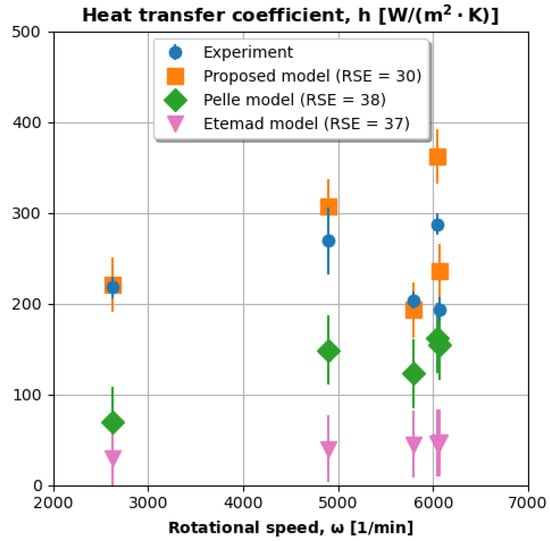 Equation (10) models flow around a rotating cylinder developed by Etemad [23]. The regime of this study (700 to 10,000) ended where our regime started (10,000 to 20,000). Moreover, this study does not include any freestream flow. Nevertheless, this model is still insightful because it studies a rotating 3D cylinder that is similar to a brushless DC motor. The exponent of Etemad’s model (0.70) is only 6% higher than the exponent of the rotational Reynolds number in the proposed model (0.66 in Equation (24)), which increases confidence in the rotational aspect of our study.