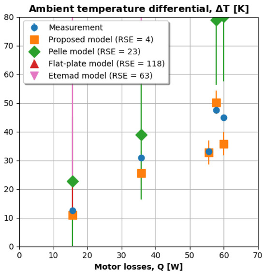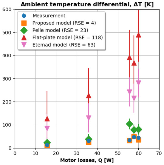 Figure 10 overlays a temperature filter to the data presented in Figure 9 to remove 18 uncertain cases. The filter removed cases where < 10 K and > 80 °C. The steady-state criterion was < 1 K/min. Therefore, the filter only kept cases where the steady-state temperature differential was >10× the criterion’s resolution. The non-conductive delrin layer between the motor and stand had a maximum service temperature of 80 °C. Therefore, the filter excluded cases where the motor’s temperature exceeded this critical temperature at which conductive heat transfer may have begun.
