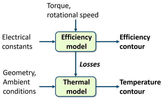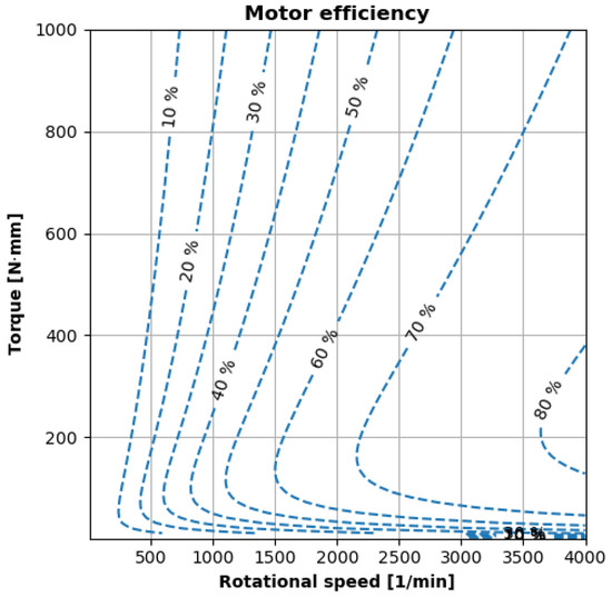 A torque sensor and a tachometer measure the motor’s output torque () and rotational speed (), respectively. The product of these readings yielded the motor’s output mechanical power (, Equation (12)). A three-phase power analyzer measured the motor’s input electrical power (). The difference between the motor’s input and output power yielded the motor’s losses (, Equation (13)).