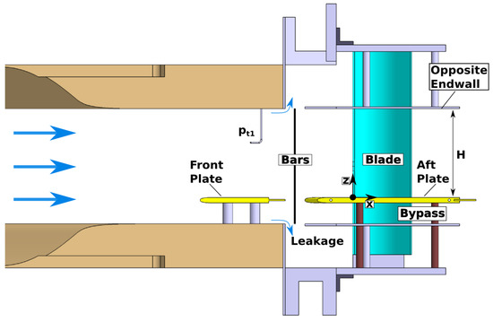 The presented experiments were conducted using a linear cascade of the T106A low-pressure turbine profile. The key geometric and flow parameters are summarized in Table 1. The T106 cascade has a long research history, and the aerodynamic performance of the original design is well known under various operating conditions, see, e.g., Kampitsch et al. [14], Kirik and Niehuis [15], or Michelassi et al. [16]. However, the cascade used here is a redesign that was specifically developed for endwall flow measurements under periodic inflow and high-speed conditions (). The blade profile geometry remains unchanged, though. The main features of the current cascade are a sufficiently thick endwall boundary layer and the ability to perform variations in the boundary layer conditions on this endwall. The challenge regarding the endwall boundary layer stems from a gap between the wind tunnel and the cascade endwalls upstream of the blade passages. This gap, which is needed for the moving bar wake generator, enables a leakage flow driven by a negative pressure gradient. While the freestream flow is not affected, it can act as a boundary layer suction, leading to weak secondary flow. To counteract this problem, the current cascade features an integrated split flat plate at part-span that serves as a turbine endwall (marked in yellow in Figure 1). Using a modular composition of the aft plate, various measurement techniques can be implemented with manageable effort. The endwall boundary layer can be adjusted by misaligning the front plate with respect to the aft plate. During all measurements presented in this paper, the endwall boundary layer thickness was = 4.62 mm with a shape factor of = 1.86 at Chord C upstream of the blade’s leading edge (LE). A detailed description of the particular test case design and an investigation of the effects of endwall boundary layer variations on the secondary flow and loss production can be found in [8,13].