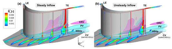 Simulated entropy generation rate ( non-dimensionalized) at several axial slices inside the T106A blade passage under steady (a) and periodically unsteady inflow conditions (b); adapted from Schubert et al. [13]; (HSVp—pressure side leg of horseshoe vortex; PV—passage vortex; CRV—counter-rotating vortex; CV—corner vortex; LE—leading edge; TE—trailing edge).