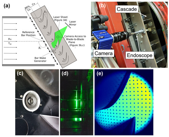 The 2D2C PIV setup for blade-to-blade measurements inside the T106A linear cascade; (a) schematic of the cross-sectional side view; (b) endoscopic camera setup; (c) optical access into the flow channel; (d) PIV laser sheet at = 0.2; (e) camera calibration target in the field of view.