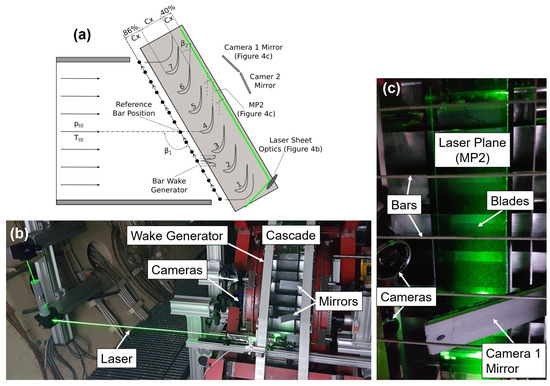 PIV setup for 2D3C measurements in an axial plane (MP 2) located downstream of the blade passage; (a) schematic of the cross-sectional side view; (b) camera setup and laser guidance to the test section; (c) laser sheet in the cascade exit flow.