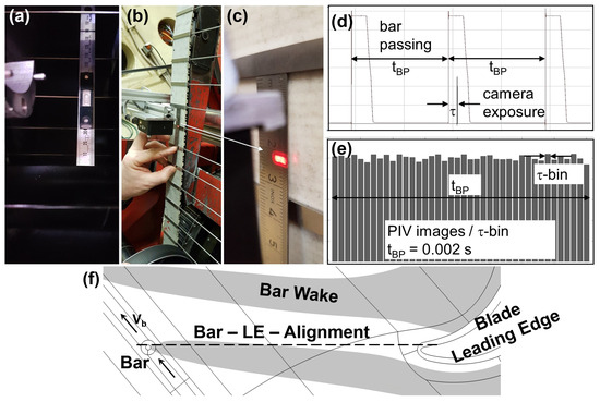 A phase-averaging method according to Bitter and Niehuis [26] was performed in both PIV setups whereby all velocity fields were related to the bar reference position outlined in Figure 5. The recording of both the camera trigger timing and the bar position signals at more than 1 MHz ensured precise sorting of all images and enabled a time-dependent discussion of the periodic wake effects in both PIV measurements, which were performed subsequently. The image sets were recorded at 15.1 Hz, while the dominant bar passing frequency was 502 Hz. The data had to be synchronized in post-processing by establishing a correlation between the geometric bar position and the temporal bar period . The first step is to define a reference bar position. In the experimental setup, a bar was aligned with the leading edge of the measurement blade by placing a steel ruler on top and leveling it (see Figure 5a). This reference bar position was then identified by measuring the current pitchwise distance to the next trigger point of an optical sensor, which registers each passing bar (see Figure 5b,c). Finally a timestamp was assigned for each measurement point by determining the relative time difference to the next bar trigger (see Figure 5d)