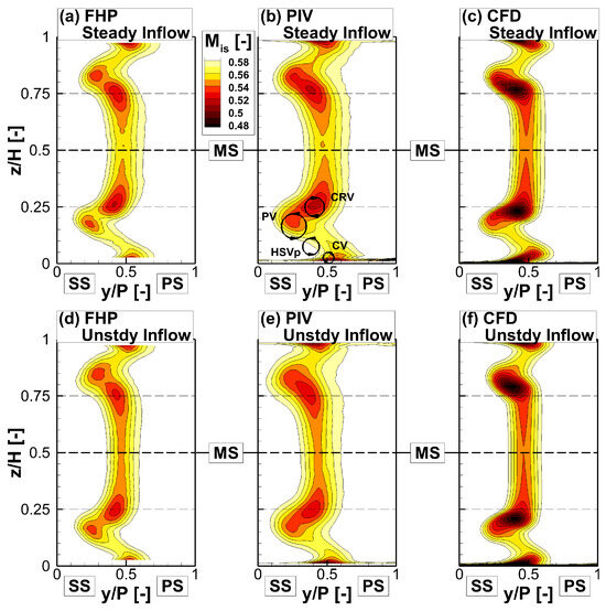 Time-averaged velocity distributions illustrated by isentropic Mach number in the downstream flow field (MP 2) under steady (a–c) and periodically unsteady inflow conditions (d–f).