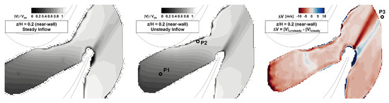 In Figure 7, time-averaged blade-to-blade flow fields measured near the endwall at = 0.2 are shown under steady and periodically unsteady inflow conditions. The velocity values in the left and center plots were ensemble-averaged over the entire image series and normalized by the theoretic exit velocity of = 195.8 m/s at = 0.59. On the right, the time-averaged effect of the periodically incoming wakes is highlighted by the absolute velocity difference (blue—positive; red—negative). Throughout the passage flow field, the absolute velocity is slightly lower under periodically unsteady inflow conditions, resulting in a negative delta. The effect is strongest in the blade wake, leading to a higher time-averaged velocity deficit. The measured mean inlet velocity loss matches well with previous analytical calculations and CTA measurements by Schubert et al. [8], validating the PIV setup in the blade-to-blade plane. In a rotating turbine with multiple blade rows, the inlet losses close to the endwall will likely be even higher because the incoming wakes are superimposed with upstream secondary flows. In the white areas, especially close to the suction surface of the upper blade, data availability is limited due to the strong background illumination caused by direct laser reflections. Unfortunately, in this region, the secondary vortex system is partially formed and interacts with the blade profile flow, as seen in Figure 2. However, downstream of the trailing edge, a blue area is apparent on the suction side of the blade wake, which leads to the position on the passage vortex core in MP 2 (see in Figure 7). This positive velocity delta illustrates a reduction in the velocity deficit due to vortex dissipation and thus implies attenuation of the secondary flow.