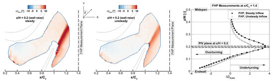 An alternative way to quantify the time-averaged secondary flow attenuation by the incoming wakes is by measuring the flow angle perturbation, as illustrated in Figure 8. The reference FHP measurements on the right side of Figure 8 illustrate the spanwise distribution of the pitchwise-averaged secondary outflow angle in the axial plane MP 2 [8]. It is apparent that the vortex motion of the secondary flow, which is mainly driven by the dominant passage vortex, causes overturning in the nearest proximity of the endwall, followed by a region of underturning. Thus, the level of over-/underturning is a gauge of the secondary flow intensity. The ‘near-wall’ blade-to-blade plane of the PIV measurements was chosen to be located at the peak of the pitchwise-averaged underturning ( = 0.2). Since the secondary flow angle is calculated by subtracting the midspan flow field, the two visible passage flow fields in Figure 8 are reduced in size. This is a consequence of the 67° opening angle of the camera endoscope. It is apparent that the positive flow angle difference, i.e., underturning, starts slightly downstream of the midpoint of the passage ( 0.6) as a reaction to the strong transverse pressure gradients, which force the initial overturning in the endwall boundary layer. Under periodically unsteady inflow conditions, the level of underturning is reduced inside the passage and in the downstream flow field. The PIV data indicate the same quantifiable trend as the probe measurements but in a much larger and less accessible measurement field. In addition to the secondary losses associated with the dissipation of the vortices, aerodynamic performance suffers from high over-/underturning since the downstream blade rows experience severe off-design conditions. Hence, endwall flow effects such as over-/underturning must be considered in the design of a turbomachinery stage.