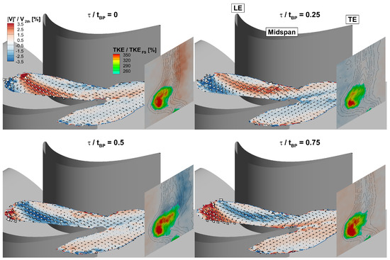 The secondary vortex intensity, as the second evaluation indicator, is measured by turbulent kinetic energy relative to the mean freestream TKE. It is apparent in Figure 9 that the TKE level increases as the bar wake passes through the secondary flow region ( = 0.25 and 0.5). However, it continues to increase beyond the passing of the pressure side ( = 0.75). Hence, the TKE evolution in the secondary flow region is not synchronized with the overlap of the bar wake in MP 2. In fact, the periodic change of averaged local TKE in Figure 11a exhibits the same phase lag of −108° to the bar wake passing as the secondary flow extension. However, for the secondary flow intensity, it is the low levels of TKE that are associated with the bar wake effects. Therefore, both signals are in sync even though they appear to have a 180° lag. This means the lowest intensity correlates to the highest pitchwise extension, or in other words, at that moment, the secondary vortices are less distinct due to a higher degree of mixing.