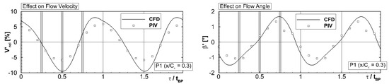 A comparison of the velocity fluctuations and the passage flow angles between the experiments and the numerical simulations is performed in Figure 10. The data for the time plot were extracted at location ( = 0.3), which is marked in Figure 7. Good correlation for both phase and amplitude between experiments and CFD is evident. The lower peak amplitudes of around 3%-points for the measured data is partially due to the fact that the CFD data are exported at a higher number of 80 time steps per period, while the measured fluctuations are phase averaged in 20 -bins.