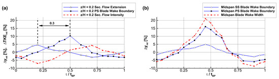 Next to the PIV blade-to-blade plane, Figure 9 also includes the PIV measurements in the downstream flow field. The transport of the bar wakes is clearly traceable all throughout the blade passage into the downstream axial plane (MP 2), which illustrates the quality of the two isolated measurements and the applied synchronization method. The additional black velocity contour lines and turbulent kinetic energy enables the relation between the sequence of the moving bar wakes and their effects on the downstream flow field. There are two major indicators by which these effects were evaluated: the pitchwise extension of the secondary flow field and the intensity of the vortex interaction. As the bar wake travels from left to right through the axial plane, it overlaps with the secondary flow field on the suction side of the blade. During this process, the extension of the secondary flow field remains relatively stable. However, the width of the blade wake is significantly increased, especially on the pressure side of the blade ( and ). On the other hand, when the bar wake is out of the frame in MP 2, the blade wake is significantly narrower ( and ). In order to better quantify these effects, the flow velocity iso-line value of = 95% was defined as the boundary of the secondary flow field and the blade wake. Its position was then measured on the suction side and pressure side in each time step. The resulting periodic shift at = 0.2 relative to the time-averaged position is shown in Figure 11a. The suction-side boundary is an indicator of the secondary flow extension, while the pressure-side boundary reflects the blade wake. Both assumptions are validated by confirming that the periodic sequences are in phase to key reference signals (see below). In all cases, positive values represent widening and negative values represent narrowing. The maximum blade wake extension is around three times higher than the maximum secondary flow extension. However, the most important finding here is not related to amplitudes but rather a phase lag of −108°, i.e., = −0.3 between the secondary flow extension and the blade wake extension. This phase lag is unique to the secondary flow and different from the behavior at midspan. Here, the start of the widening of the downstream blade wake corresponds to the overlap with the bar wake. As the bar wake passes through the axial plane, the suction- and pressure-side blade wake boundaries at midspan are affected simultaneously, i.e., 0° phase lag (see Figure 11b). This results in an increase in the wake width of up to 165%. All three midspan sequences are virtually in-phase (18° phase lag) with the pressure-side extension at = 0.2, proving it to be representative of the blade wake.
