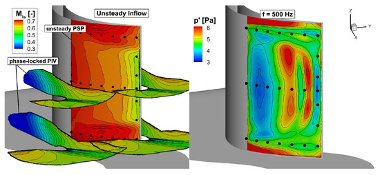 The results presented here are an essential basis for the subsequent investigation of the near-endwall blade suction surface effects in the second part of this two-part publication. A preview of the comprehensive experimental data set comprising periodically unsteady suction surface pressure fields is given in Figure 12. The surface data were measured with unsteady pressure-sensitive paint (i-PSP). The i-PSP measurements were performed using the intensity method, high-power uv-LED excitation, and a high-speed camera sampled at 30 kHz. Single- to double-digit Pascal pressure amplitudes could be resolved precisely and correlate well with CFD. Furthermore, two frequency filtering methods were compared to identify distinct flow features in the frequency spectrum up to several kilohertz.