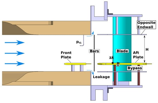 The presented experiments were conducted using a linear cascade of the T106A low-pressure turbine profile. The key geometric and flow parameters are summarized in Table 1. The T106 cascade has a long research history, and the aerodynamic performance of the original design is well known under various operating conditions, see, e.g., Kampitsch et al. [], Kirik and Niehuis [], or Michelassi et al. []. However, the cascade used here is a redesign that was specifically developed for endwall flow measurements under periodic inflow and high-speed conditions (). The blade profile geometry remains unchanged, though. The main features of the current cascade are a sufficiently thick endwall boundary layer and the ability to perform variations in the boundary layer conditions on this endwall. The challenge regarding the endwall boundary layer stems from a gap between the wind tunnel and the cascade endwalls upstream of the blade passages. This gap, which is needed for the moving bar wake generator, enables a leakage flow driven by a negative pressure gradient. While the freestream flow is not affected, it can act as a boundary layer suction, leading to weak secondary flow. To counteract this problem, the current cascade features an integrated split flat plate at part-span that serves as a turbine endwall (marked in yellow in Figure 1). Using a modular composition of the aft plate, various measurement techniques can be implemented with manageable effort. The endwall boundary layer can be adjusted by misaligning the front plate with respect to the aft plate. During all measurements presented in this paper, the endwall boundary layer thickness was = 4.62 mm with a shape factor of = 1.86 at Chord C upstream of the blade’s leading edge (LE). A detailed description of the particular test case design and an investigation of the effects of endwall boundary layer variations on the secondary flow and loss production can be found in [,].