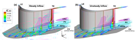 Simulated entropy generation rate ( non-dimensionalized) at several axial slices inside the T106A blade passage under steady (a) and periodically unsteady inflow conditions (b); adapted from Schubert et al. []; (HSVp—pressure side leg of horseshoe vortex; PV—passage vortex; CRV—counter-rotating vortex; CV—corner vortex; LE—leading edge; TE—trailing edge).