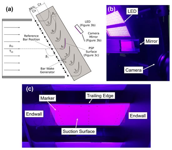 In view of the high potential of the pressure-sensitive paint technique (PSP) demonstrated in the classical fields of experimental aerodynamics, its published application in turbomachinery research is rather low, compare, e.g., Liu et al. [] or Lepicovsky and Bencic []. The standard works of Liu et al. [] or Gregory et al. [] reveal a large number of PSP applications covering nearly all branches of aerodynamics. The quality of the PSP results is impacted by various external factors, such as surface contamination, non-uniform surface temperatures, or limited optical access. This sensitivity often prevents the quantitative usage of the PSP technique in the area of rotating turbomachinery beyond simplified lab tests, as underlined, e.g., by Peng and Liu []. Nevertheless, Gao et al. [] described the big potential of the turbomachinery research linked to (linear) blade cascades for the application and development of the PSP technique. As, e.g., Marks et al. [], Gao et al. [], and Dong et al. [] have shown in steady inflow test cases, the knowledge of (unsteady) surface pressure enables a better understanding of complex aerodynamics like they may appear in a linear cascade, especially if the vortex interaction in the secondary flow regime is in focus. The author’s motivation in choosing unsteady PSP to further resolve the surface dynamics of the wakes was raised by the experience of applying this experimental technique to answer turbomachinery-related research questions, compare Bitter et al. [,,].