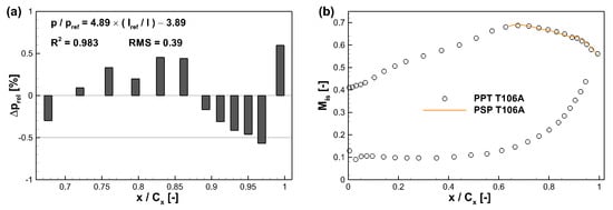 The PSP measurements were validated by a comparison to reference data from static pressure taps. Figure 4 illustrates the relative error after the in situ calibration with respect to each pressure tap and the resulting isentropic Mach number distribution at the midspan of the blade suction surface. The PSP data mostly exhibit slightly higher pressure values, i.e., a lower Mach number except for a slightly increased peak Mach number at = 0.67 and a more distinct pressure plateau at the separation bubble near the trailing edge. However, the linear fit applied in the in situ calibration with a slope of 4.9 lead to an overall good match of the reference points with a value of 98.3% and RMS pressure deviations of 0.39% with a maximum of ±0.6%.