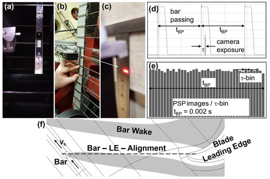 In order to enable an investigation of the time-dependent effects of periodically incoming wakes, a phase-locking method according to Bitter and Niehuis [] was applied to the PSP measurements as well as both PIV setups presented in part 1 []. Here, it is critical that the PSP sampling frequency and the dominant bar passing frequency (502 Hz) are decoupled so that the pitchwise bar positions are randomly distributed during the measurements. Synchronization is achieved in post-processing by establishing a correlation between the geometric bar position and the temporal bar period . The first step is to define a reference bar position. In the experimental setup, a bar was aligned with the leading edge of the measurement blade by placing a steel ruler on top and leveling it (see Figure 5a). This reference bar position was then identified by measuring the current pitchwise distance to the next trigger point of an optical sensor, which registers each passing bar (see Figure 5b,c). Finally, a timestamp was assigned for each measurement point by determining the relative time difference to the next bar trigger (see Figure 5d).
