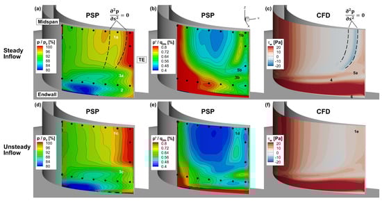 Measured static pressure distribution and supplemental CFD on the T106A suction surface under steady (a–c) and periodically unsteady (d–f) inflow conditions; (a,d) time-averaged pressure (PSP); (b,e) standard deviation of pressure fluctuations (PSP); (c,f) wall shear stress (CFD).