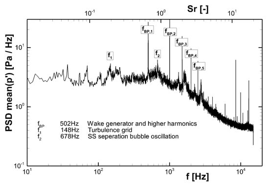 The frequency spectrum of the PSP measurement data is illustrated in Figure 7. As can be seen by the decreasing pressure amplitudes over the entire frequency range of 15 kHz, the measurement setup enabled a high-speed detection of small pressure fluctuations down to the single-digit Pascal range. The sporadic pressure peaks at very high frequencies can be attributed to aliasing effects. The dominant pressure signal of the bar wake generator at 502 Hz and its higher harmonics are clearly captured.