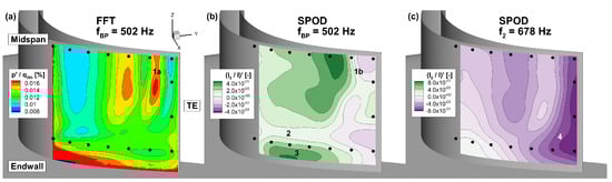 In order localize the wake-induced fluctuations amplitudes, two methods of frequency-based data filtering are compared in Figure 8. This was achieved by data conversion into the Fourier space (a) or by applying a spectral proper orthogonal decomposition averaged over 100 time steps (b,c). In the FFT-based data, the 2D flow at 502 Hz features spanwise (vertical) bands of high and low fluctuations. This pattern is similar to the alternating vorticity around midspan in the CFD results (see Figure 2a), and is associated to the wake effect on the highly loaded rear suction surface. The highly resolved distributions of pressure amplitudes and phase (not shown here) at distinct frequencies can also be used as input and validation data for frequency-based CFD methods, like the harmonic balance approach []. In the SPOD data at 502 Hz, two regions of positive and negative fluctuations are present in the 2D flow. Both coincide with one of the consecutive high–low -patterns in the FFT data. In the secondary flow region, the fluctuations of the passage vortex are more clearly identifiable by a narrow streamwise band of fluctuation levels close to zero. This finding is in accordance to the phase-locked data discussed in the next chapter, where the periodic movement of the pressure iso-lines is limited to the streamwise direction. Just below this region is the fluctuation imprint of the HSV pressure side leg with negative amplitudes, indicating an opposite sense of fluctuation. Without prior knowledge of a source frequency, as in case of the wake generator, it can be difficult to associate pressure fluctuation peaks. In these cases, SPOD can be a valuable post-processing method to identify the fluctuation source. For example, at = 678 Hz, the amplitude distribution shows only negative signs and the dominant values are located near the trailing edge in the reattachment region. In the non-frequency-filtered data, this region is confined by the dominant secondary flow. In contrast, at , it extends all the way to the endwall with little disturbance. Thus, this fluctuation peak can be associated to the separation bubble oscillation, which is confirmed by similar frequency ranges of comparable turbine blade profiles []. Some of the higher harmonics of the bubble oscillation, which is not distinctly at one frequency but rather a narrow range can be seen between the bar wake harmonics .