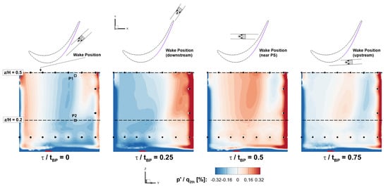 Although the time-averaged PV liftoff is hereby reduced by the wakes, its phase-locked movement in spanwise direction is close to zero. Once the bar wake has traveled further downstream, only the high-pressure region associated to the wake is present close to the trailing edge at = 0.25. In contrast to the previous time step, this effect extends over the entire blade span, albeit it is less intense near the endwall. Immediately after the wake has completely passed at around = 0.35, the pressure fluctuations across the captured suction surface section are close to zero. Halstead et al. describe this part of the bar period as a calming region in their time-space illustration at midspan []. The present results indicate that this description can be extended to the secondary flow region, where only minimal differences to the time-averaged flow field are present and the passage vortex imprint is not identifiable in -distribution (see Figure 11). At = 0.5, the bar wake is located in the blade passage far from the suction surface (see Figure 10). This time step has the closest resemblance to the steady inflow case, which was measured separately as a reference. Most of the suctions surface exhibits elevated levels of pressure except for the 2D flow region close to the trailing edge. Here, a quick streamwise change from positive to negative pressure fluctuations indicates the reattachment of a separation bubble, which has formed in the absence of the bar wakes. The last time step in Figure 9 at = 0.75 shows the upstream wake presence entering the field of view by a low pressure region on the left. However, the effects on the rear section are already establishing with a diminishing gradient in the 2D flow and near-endwall levels closer to the time-average.