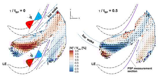 Phase-locked PIV measurements of the bar wake velocity deficit in the T106A turbine passage close to the endwall ( = 0.2) at two time steps and its effect on the blade surface pressure; adapted from part 1 [].