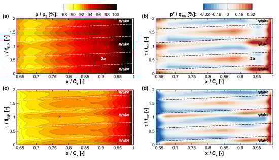 The part of the period where a separation bubble has formed in the absence of a wake can be identified by a local decrease in pressure (see 2a in Figure 11a) and a change from a high- to low-pressure fluctuation ( red to blue), starting at ≈90% at midspan (see 2b). This is not to be confused with the negative spatial pressure gradient induced by the wakes. In addition to the pressure gradient effect, the wake also induces a local turbulence increase, which strengthens the boundary layer robustness. This important factor cannot directly be captured by the sole surface pressure measurements and requires supplemental experimental or CFD data. In the present case, it leads to an earlier turbulent transition at midspan and a resulting periodic suppression of the separation bubble inside the wake-lanes. A difference between the two spanwise slices is apparent in the peak around = 0.15. The high amplitude at midspan is a result of the low reference pressure in the bubble reattachment region and, therefore, fades towards the endwall.