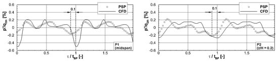 A comparison of the measured phase-locked pressure fluctuations with CFD results was performed in two locations, as illustrated in Figure 12. Position is located in the 2D flow region around midspan, where the separation bubble appears ( = 0.91). is located at the same streamwise position, but at = 0.2, where the endwall effects become a factor (see Figure 9). The wake-induced upstream high-pressure and downstream low-pressure regions are apparent in both locations, with ≈±0.16% at and ≈±0.22% at . The intensified wake effect near the endwall found in Figure 11 can be quantified here by a 33% increase of the 98 Pa/ms pressure gradient at midspan. Despite the different flow regimes at the two positions, the pressure fluctuations are in phase. This also holds true for the CFD data, however, there is a phase shift to the PSP signals of around 36°, i.e., . While the pressure amplitudes and the basic periodic sequence can be reproduced in the numerical simulations, the predictions are not as accurate as in the case of the velocity field in the front part of the blade passage ( = 0.3). Here, a phase shift between 0° and 36° was presented in part 1 []. The main difference at is an exaggeration of the low-pressure region before the wake passing, and thus a severe increase in the pressure gradient of 188%. This is caused by a well-known attenuation of the wake mixing process in RANS-based simulations, leading to more pronounced wakes further downstream. Adjusting the wake mixing to measured values would require a large increase in the modeled turbulent length scale, which, in return, would lead to unrealistic loss production levels. At ( = 0.2), the wake-induced pressure gradient is well reproduced with a delta to the measurements of −7%, but during the wake absence, the pressure levels are elevated in the CFD. Overall, resolving the unsteady pressure fluctuations with single- to double-digit Pascal amplitudes is challenging for conventional simulation methods. Therefore, highly resolved surface pressure data measured with unsteady PSP, as presented here, has a high potential for CFD validation and provides a reference for improving numerical methods.