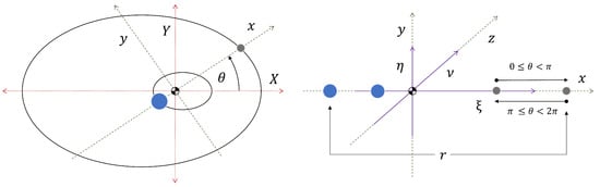 where p denotes the semi-latus rectum of the ‘elliptical’ system and r denotes the normalized distance between the primary and secondary. Additionally, refers to the relative mass parameter, and indicate the distance from the spacecraft to the primary or secondary, respectively, as measured in the pulsating frame. Note that the primed/stroked quantities in Equation (1) denote derivatives and corresponding order with respect to the true anomaly, , rather than time.