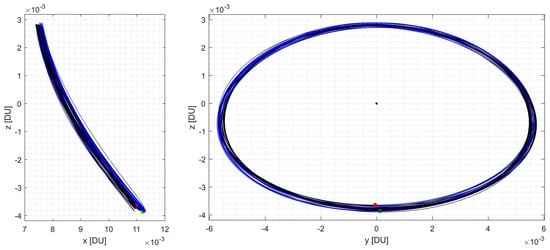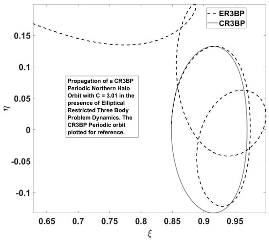 For the remainder of this paper, the canonical conversions are in the context of the Earth–Moon system, , 1 DU = 389,703 km, and 1 TU = 382,981 s which consistent with the Three-Body Periodic Orbit Database []. The initial conditions for members of the CR3BP periodic orbit families were obtained and developed as a part of this work from this database and used as a warm-start for the algorithms. Figure 3 depicts the deviation from traditional periodic behavior in the presence of the ER3BP dynamics within the Earth–Moon system underscoring the loss of periodicity.