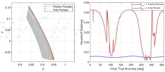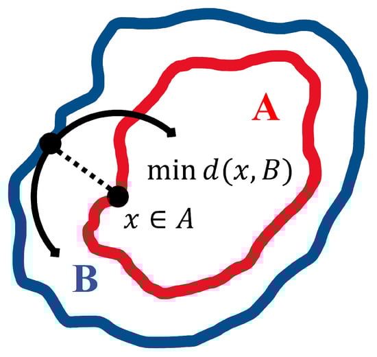 The previously described continuation scheme leads to an unbounded traversal of the dense solution space. Additionally, if the orbital revs are geometrically dissimilar, the dataset is not immediately useful for tasks like designing an optimal orbit maintenance strategy. Therefore, a shape similarity metric was introduced to filter out orbit revs from the comprehensive dataset that geometrically resemble the parent orbit. Although studies on shape-similar orbits have been done, they have yet to quantify it []. The Hausdorff Distance (HD) is a topographic metric that determines the proximity of two sets by cataloging and comparing the largest deformation distance between members of the sets. Determining the supremum of all the infimum (see Figure 4) distances provides an approach whereby shape similarity can be effectively quantified.