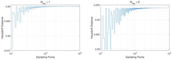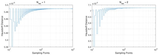 Computing HD for quantification of shape similarity between two continuous orbits is affected by the discretization or sampling density. Therefore, an optimal sampling density was identified by conducting a convergence analysis. It is hereby noted that, once discretization was performed, the infimum was calculated by employing a simple vector difference approach. Figure 5 shows the convergence of HD for two distinct orbits from the same parent counterpart—Halo Orbit from the Northern EML1 Family, for one rev and two revs. Figure 6 shows the same process applied to a Northern EML3 with for an identical initial geometry. For all four cases, the orbits were sampled at increasing densities up to 1000 with a parent orbit reference sampling density of 5000 points. It was observed that the HD magnitude converged for sampling density ≥200 as shown for the HPOs. Numerical identification of the optimal sampling density led to a more efficient algorithm workflow. Furthermore, HD effectively enables the filtering of orbit revs that are shape-similar or homeomorphic to their parent orbit from the unbounded dataset of possible periodic orbit revs spanning the entire solution space.