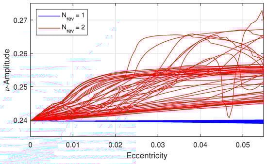 The algorithm was “warm-started” with the CR3BP “parent” orbit conditions and was differentially corrected to obtain new periodic conditions. Although the system could be “cold-started” with randomly generated initial conditions, convergence was invariably harder to achieve for such cases. Furthermore, even for the converged solutions, there is no guarantee that such a solution would be homeomorphic. Note that in Equation (3a) and (3b) for the circular assumptions, the r and parameters have values of 1 and 0, respectively. However, the pulsating frame used to analyze the ER3BP system leads to temporal variation in the r and ; the geometry is then continually defined under Keplerian assumptions. Next, continuation is performed starting with a constant initial true anomaly, , with the eccentricity continually modified in incremental steps until the desired eccentricity value is achieved and similar to the real dynamical system (e.g., for the Earth–Moon system [,]). This is unlike the real Earth–Moon which has a temporally evolving eccentricity that varies in the range of 0.0255 to 0.0775 but is restricted to allow preliminary analysis [].