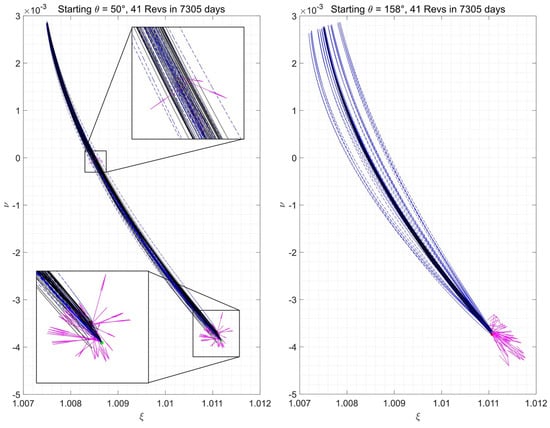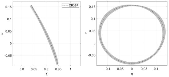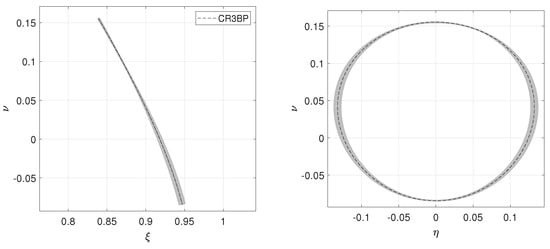 Many studies have also focused on characterizing LPOs and studying station keeping (SK) in a dynamical system of higher complexity. For instance, the restricted Ephemeris model has been used as a preliminary test for SK of halo orbits which has the effect of solar radiation pressure (SRP) embedded in the dynamical system [,]. Other studies have either focused on different three-body systems or solely analyzed the effects of non-circular orbits on the autonomous CR3BP dynamics. These studies determined the effects of eccentricity by analyzing the dynamical behavior in the Elliptic Restricted Three-Body Problem (ER3BP) [,,,,,]. It has been proved mathematically that the system dynamics become further chaotic and more unstable for any spacecraft in the ER3BP when compared to the original CR3BP []. The results are indicative of the fact that consideration of eccentricity leading to non-autonomous motion can have profound effects on the legacy dynamical structures from the more benign circular restricted case. Periodicity for halo orbit counterparts has been achieved via numerical continuation and shows significant dissimilarity from corresponding motions in the CR3BP family [,,,]. Therefore, the need to analyze systems of intermediate fidelity using advanced numerical methods to understand long-term dynamical behavior and motion structures has been established. There have been SK methods used within the ER3BP using multiple impulses per orbit-rev and a monodromy matrix analog []. The aforementioned station-keeping papers focused on keeping the CR3BP orbit as the nominal reference orbit without carrying out a robust and holistic search for novel periodic structures catering to an incremental addition of fidelity to the original autonomous dynamical system.