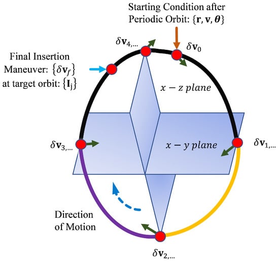 Once the dataset of all the possible periodic orbits is generated, the station-keeping process in Algorithm 3 was implemented to quantify maintenance costs for sustaining presence in the neighborhood of any CR3BP periodic orbit of interest. To commence the process, the dynamical system and starting true anomaly must be selected, thus determining the starting periodic revolution which is natural to the respective celestial geometry. Mission duration will give the necessary amount of time the spacecraft must station-keep to satisfy the desired lifetime requirements. After the ith periodic rev is finished, the spacecraft is propagated across all the future plane crossings that are accessible to commence the maneuvers. With all the possible combinations of impulses based on Figure 11 and the number of periodic orbits within the generated dataset, the selection is restricted to minimize the impulse costs at each crossing by an estimated “ideal” transfer time. Note that this requires an underlying assumption that the respective periods of the orbits are relatively close. Although this may not always be true, the resulting correction leg is bound to be quasi-optimal given the other constraints.