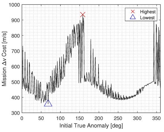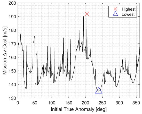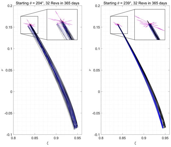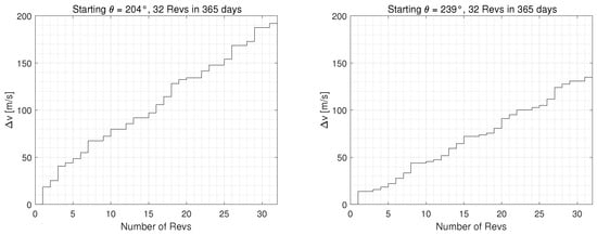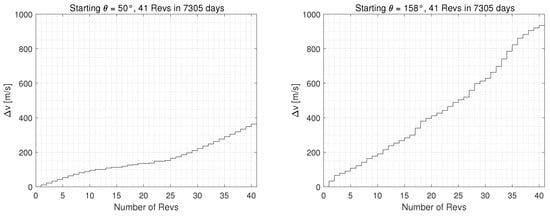 The nominal orbit in the Sun–Earth system has a period of 180 days, just under 6 months. Since the eccentricity is not constant, the value used was based on an averaged estimate near 2030 (e.g., []). The filtered database of shape-similar revs was utilized to perform station-keeping quantification for several initial geometries and Figure 16 provides a depiction similar to the previous case. The output was observed to show high sensitivity to the starting initial geometry. Even a small offset, close to a single degree, between sequential scenarios translates to drastic changes in the station-keeping costs. In Figure 17, two trajectories were presented to compare and contrast incurred costs.