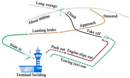Considering that aircraft inherently lack a reverse function, an aircraft’s departure process usually involves being towed by a tug using a tow bar or wheel-lift mechanism connected to the nose landing gear. This towing is performed at low speeds (not exceeding 10 km/h) and moves the aircraft to an open area (illustrated in Figure 1 as the red dashed area). Subsequently, the crew initiates engine-powered taxiing to join the takeoff queue, waiting at the runway end for flight clearance (shown in Figure 1 as the red solid line area). This pre-flight preparation phase, accounting for 10–30% of flight time [2], increases the risk [3,4,5] of aircraft damage and personnel accidents because of the need for coordination among multiple departments [6]. Additionally, a prolonged ground operation of the aircraft engines during this phase can lead to issues [7] such as foreign object damage, high fuel consumption, noise pollution, and excessive engine depreciation. Collectively, these issues signify that the traditional aircraft ground taxiing method has become a critical bottleneck constraining airport operational safety, economic efficiency, and environmental sustainability.