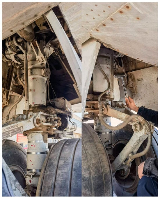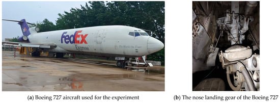As a typical Class C aircraft, the B-727 reflects the characteristics of mainstream aircraft models in terms of landing gear layout and structure. In this study, a specific B-727-200F model aircraft’s nose landing gear was surveyed within an airport, as shown in Figure 2. The survey mainly included components such as shock absorbers, drag struts, torsion arms, actuators, landing gear transfer valves, and wheels, are shown in Figure 2a,b.