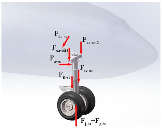 The shock absorbers and lower drag struts of the landing gear used for testing were designed as integrated components. The overall structural analysis mainly considers the landing gear’s own weight, the pressure from the upper drag strut on the lower drag strut, the support force of the actuator on the upper drag arm, the pressure from the aircraft’s weight on the shock absorber rear axle, the pressure from the torsion arms and transfer valve on the shock absorbers, the support force from the wheels and axles on the structure, and the support force from the jack on the jack platform, as shown in Figure 3.