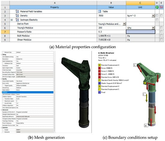 The overall structure is modeled using solid elements, primarily hexahedral elements, with the occasional use of tetrahedral elements in specific areas. The material used is 300 M steel, as shown in Figure 4.