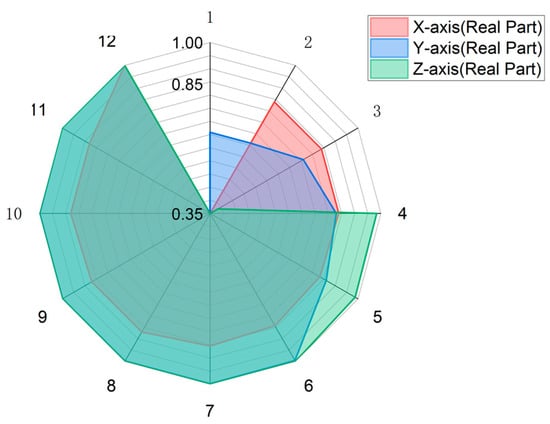 The first 12 mode shapes were calculated and the effective masses in the X-, Y-, and Z-directions were obtained. The effective masses in all directions are real values, and the cumulative effective mass fractions are shown in Figure 5.